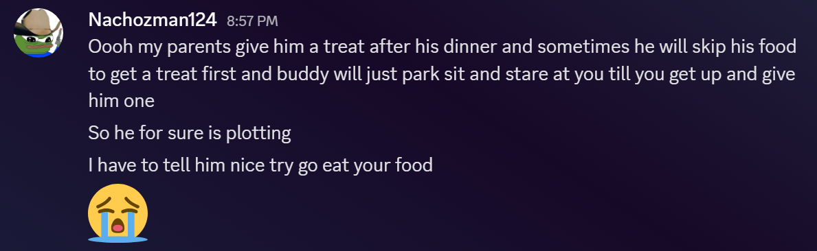 Miggy: Bonus question, he sounds a little mischievous is he up to no good often?Nachoz: My parents give him a treat after his dinner and sometimes he will skip his food to get a treat first and buddy will just parks it and stare at you till you get up and give him one.