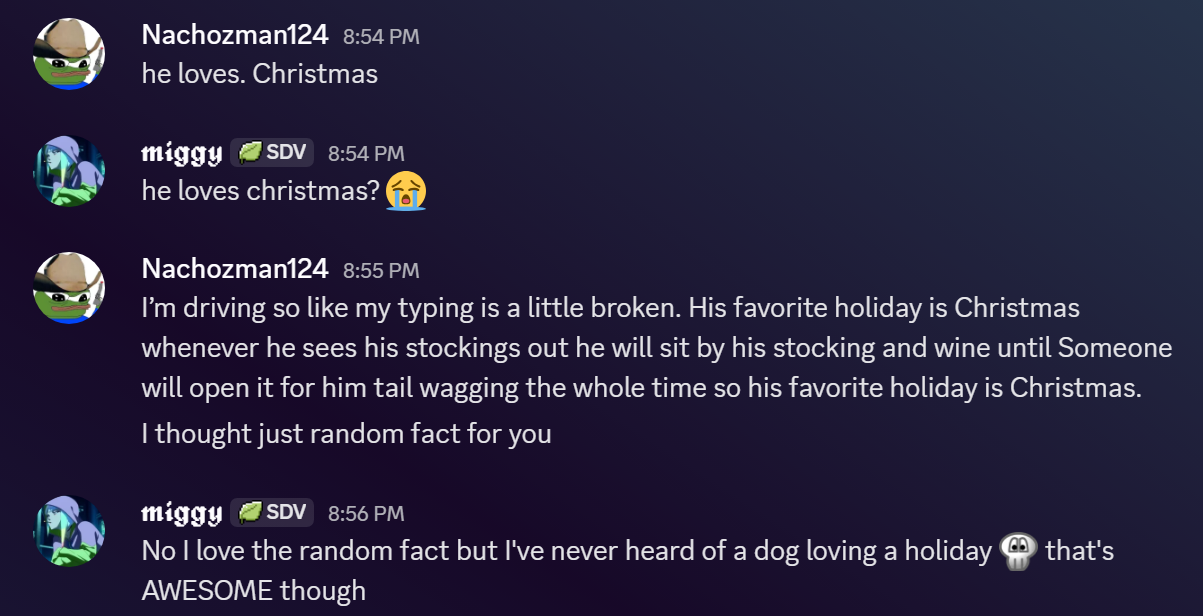 Miggy: Bonus question, he sounds a little mischievous is he up to no good often?Nachoz: My parents give him a treat after his dinner and sometimes he will skip his food to get a treat first and buddy will just parks it and stare at you till you get up and give him one.