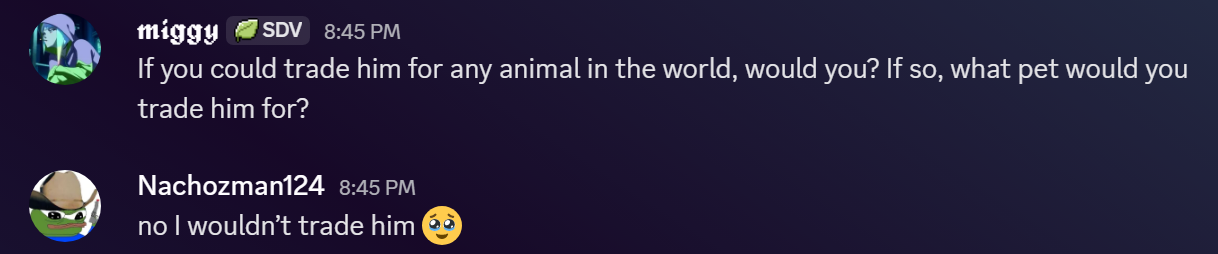 Miggy: If you could trade him for any animal in the world, would you? If so, what pet would you trade him for?