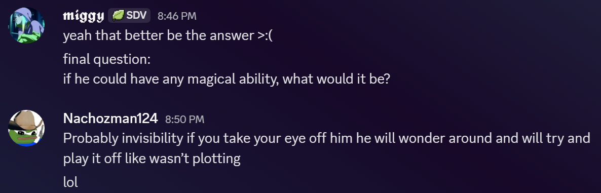 Nachoz: Invisibility if you take your eyes off him he will wonder around and will try and play it off like he wasn’t plotting