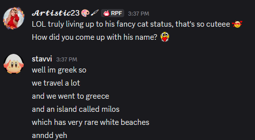 Stavvi: I’m Greek and we travel a lot so I named him Milos after the Greek island