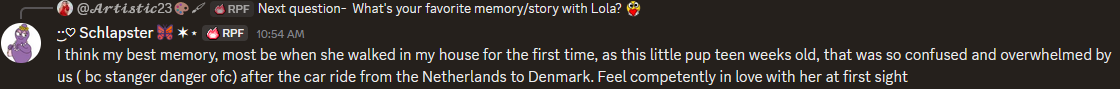 Schlapster: I think my best memory must be when she walked in my house for the first time, as a little pup 10 week sold that was confused and overwhelmed by us after the car ride from the Netherlands to Denmark.