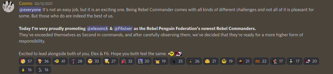 By March 2022, it was clear to me that my IRL workload had increased to such a point that I could no longer spend the required time for RPF. I’d originally planned on retiring in April at the end of March Madness, however Disney got CPR, our primary cpps and recruiting platform, to shut down. In an instant, we were left without a CPPS to play on and all our future plans were in disarray. So, I decided to stay and help out RPF until it had found itself a stable CPPS and a source of recruits. Today, I am confident that RPF is in a good spot in terms of its leadership, high command and staff and I have full faith in the current staff that they’ll take RPF to even greater heights. This short war against the Templars have proven that RPF is still far from over and we truly are the greatest army of all time. RPF’s greatest strength is its community – people like you, the reader, who stand by your fellow rebels when called upon.