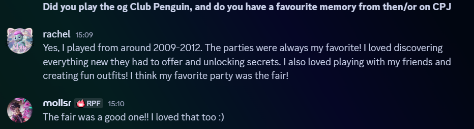 Rach is a veteran Club Penguin Player, having played 2009-2012! Her favorite is the Fair Party, and she loved getting new items and secrets! A month later, the Fair Party was held on CPJ! What a pleasant coincidence!