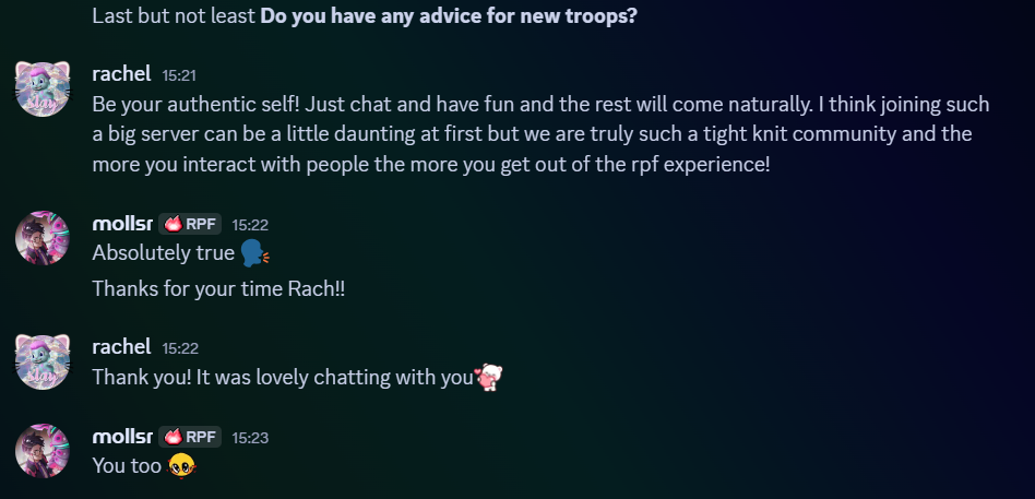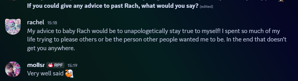 As Rach wanted to tell her past self, her advice to our new troops is to be their authentic selves! With how inclusive our community is, the rest will fall into place!