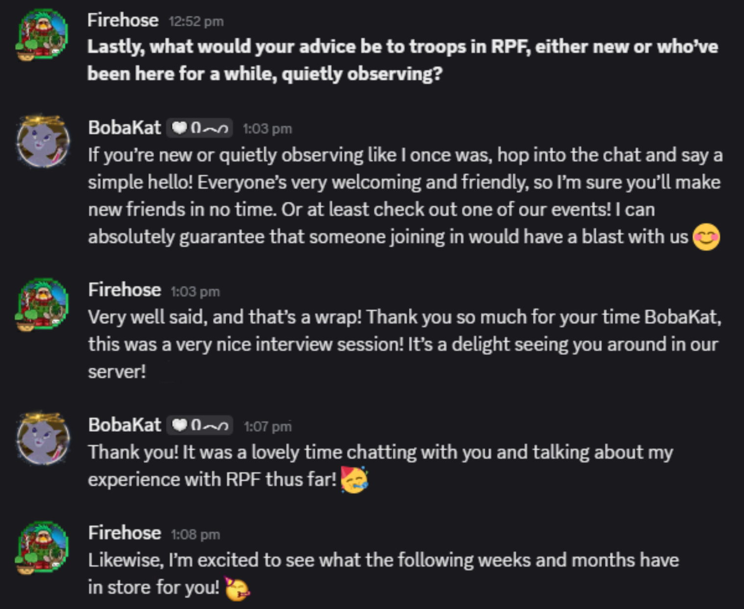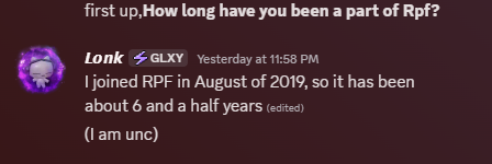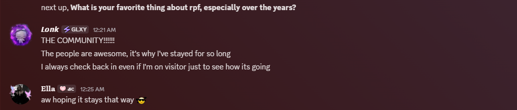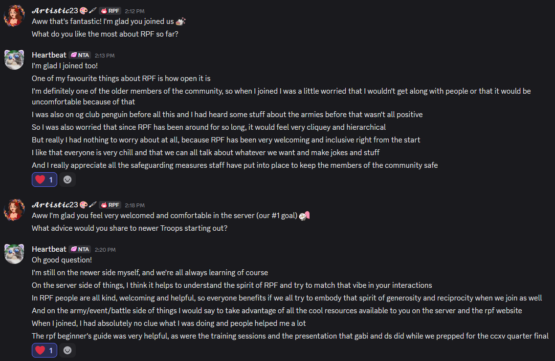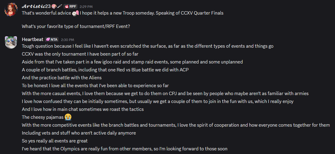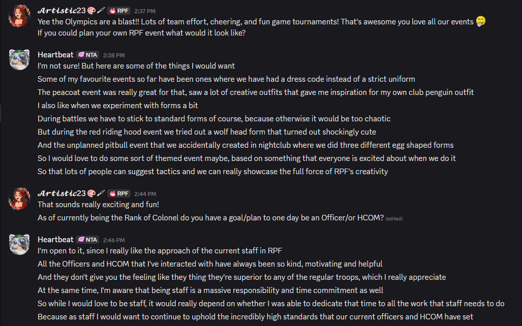 HuhBuh says she loves how open RPF is. She says that since joining RPF has been so welcoming and inclusive, everyone is very chill and that we can all joke together. Some advice HuhBuh has for new troops is to embody the spirit of generosity and reciprocity in RPF.