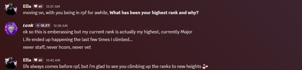 HuhBuh says she enjoys themed events and would love to see an event based on something that everyone is excited about, so there can be lots of tactic suggestions! As far as rank goals, HuhBuh is open to ranking up. She says all the Officers and HCOM she’s interacted with are very kind and motivating. It would depend on the time she can dedicate whether she would go all the way to staff.