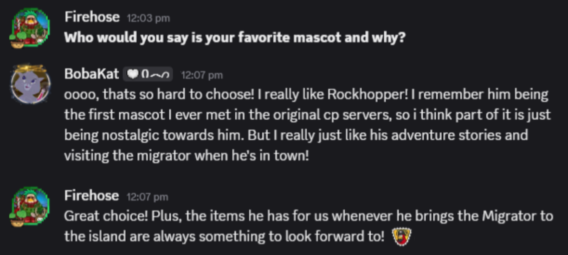 BobaKat likes Rockhopper. He was the first mascot she ever met in the OG Club Penguin, so nostalgia plays a part. She also enjoys his adventure stories and visiting the Migrator.