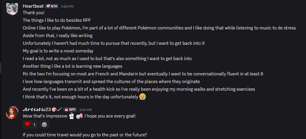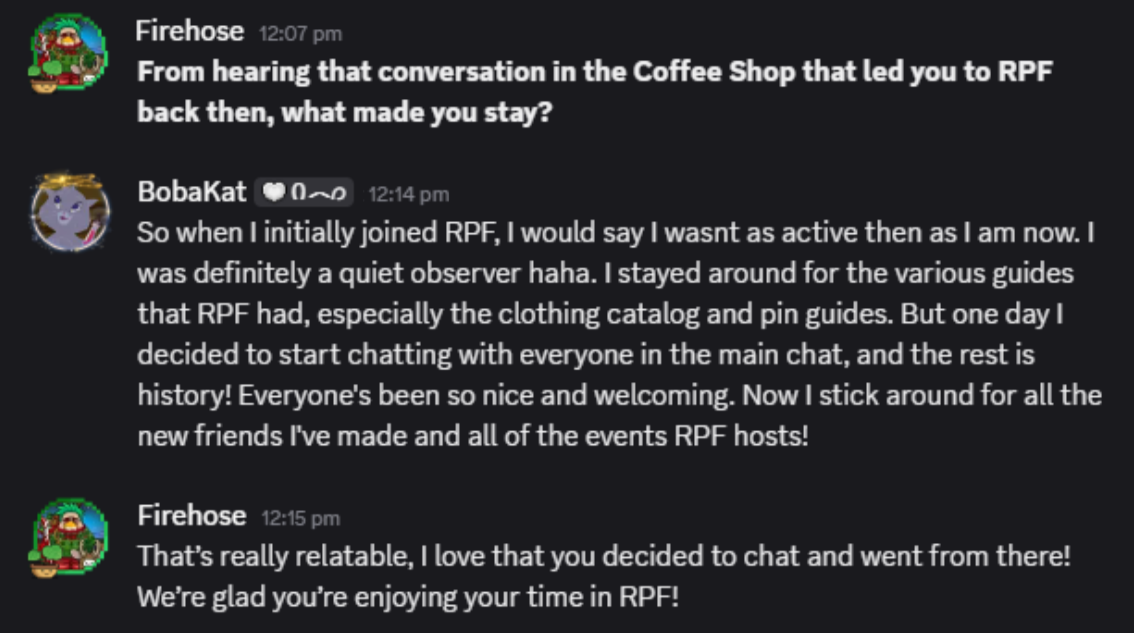 Originally, BobaKat wasn’t that active. She read guides and one day decided to chat! Everyone was very welcoming, and now she sticks around for her friends and events!