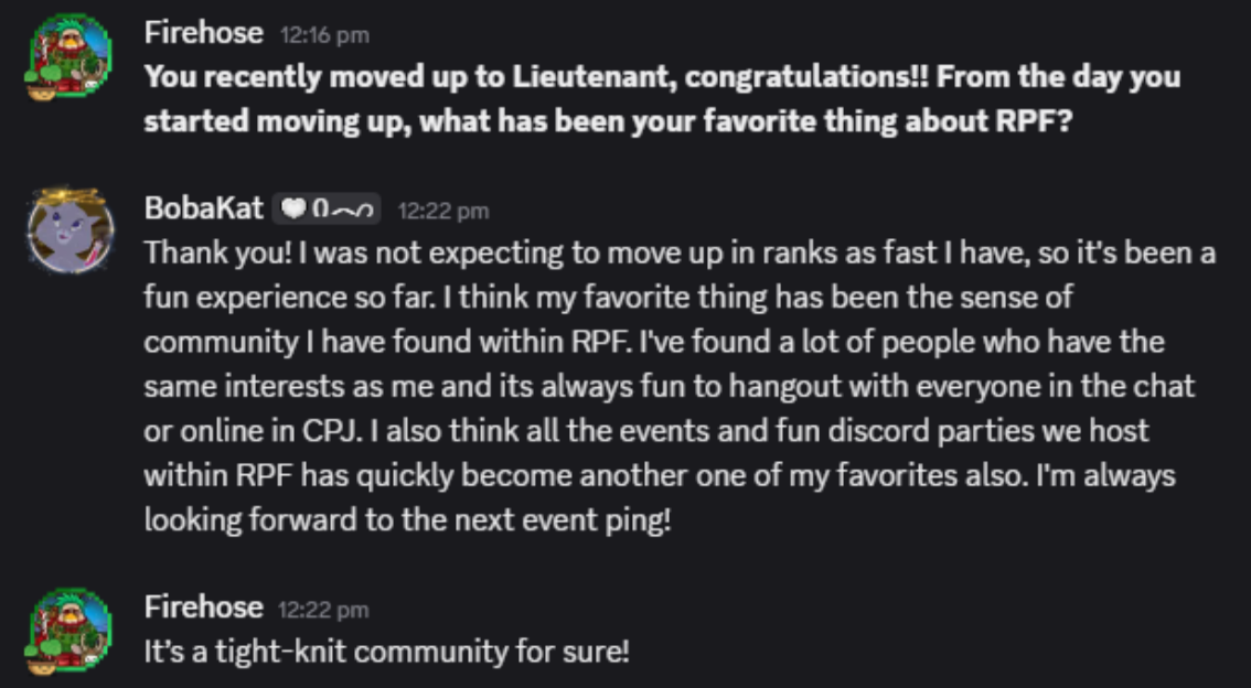 You recently moved up to Lieutenant, congratulations! From the day you started moving up, what has been your favourite thing about RPF?