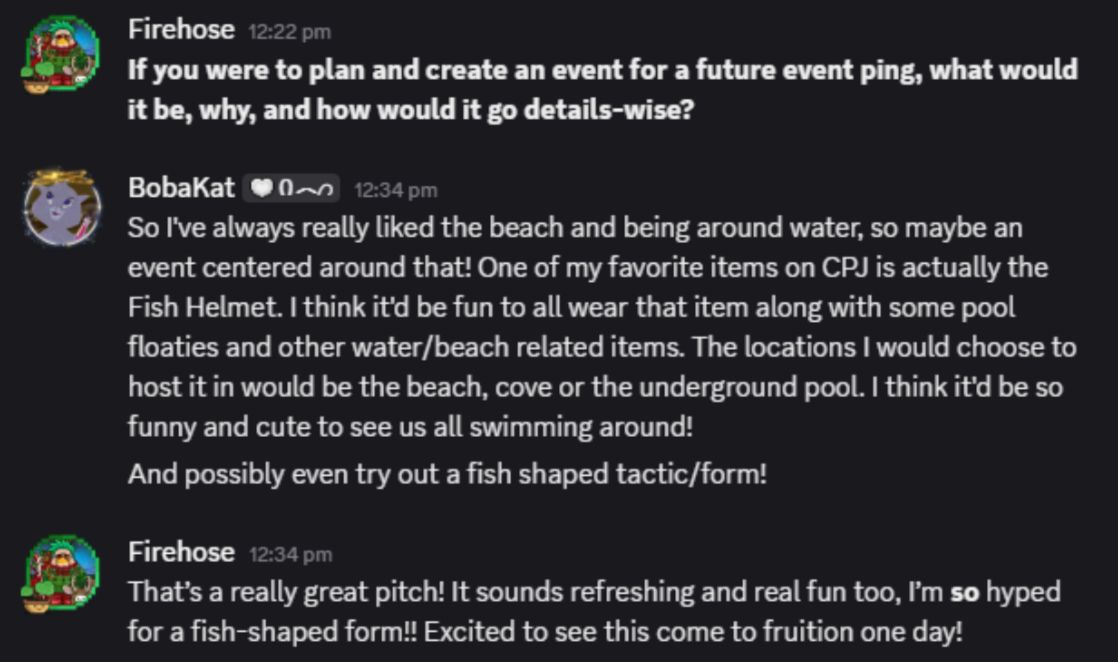 BobaKat’s advice is to pop in chat if you’re lurking and say hi! Everyone is welcoming and friendly, so you’ll make friends in no time. She also says to check out the events because they’re a blast!