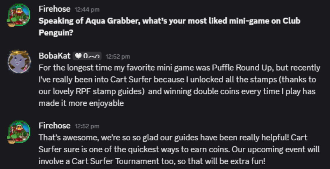 BobaKat’s favourite mini-game used to be Puffle Round Up, but has since become Cart Surfer. Earning lots of coins has made it more enjoyable!