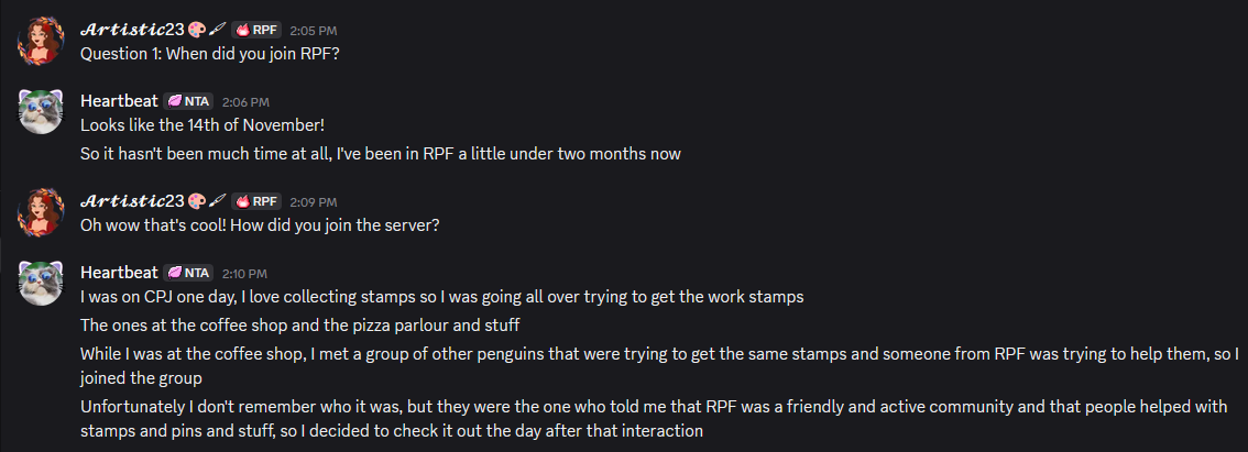 Starting off, HuhBuh recalls how they joined RPF on the 14th November when a group of penguins trying to earn the penguins at work coffee stamps were being helped by a penguin from RPF!