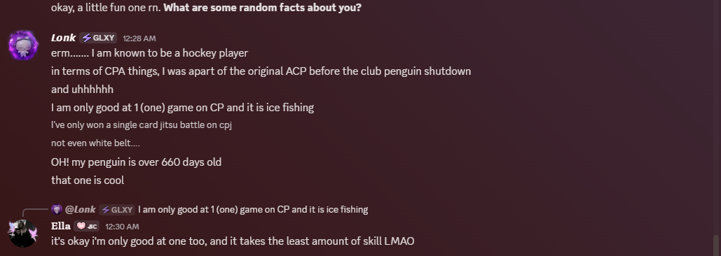 BobaKat likes Rockhopper. He was the first mascot she ever met in the OG Club Penguin, so nostalgia plays a part. She also enjoys his adventure stories and visiting the Migrator.