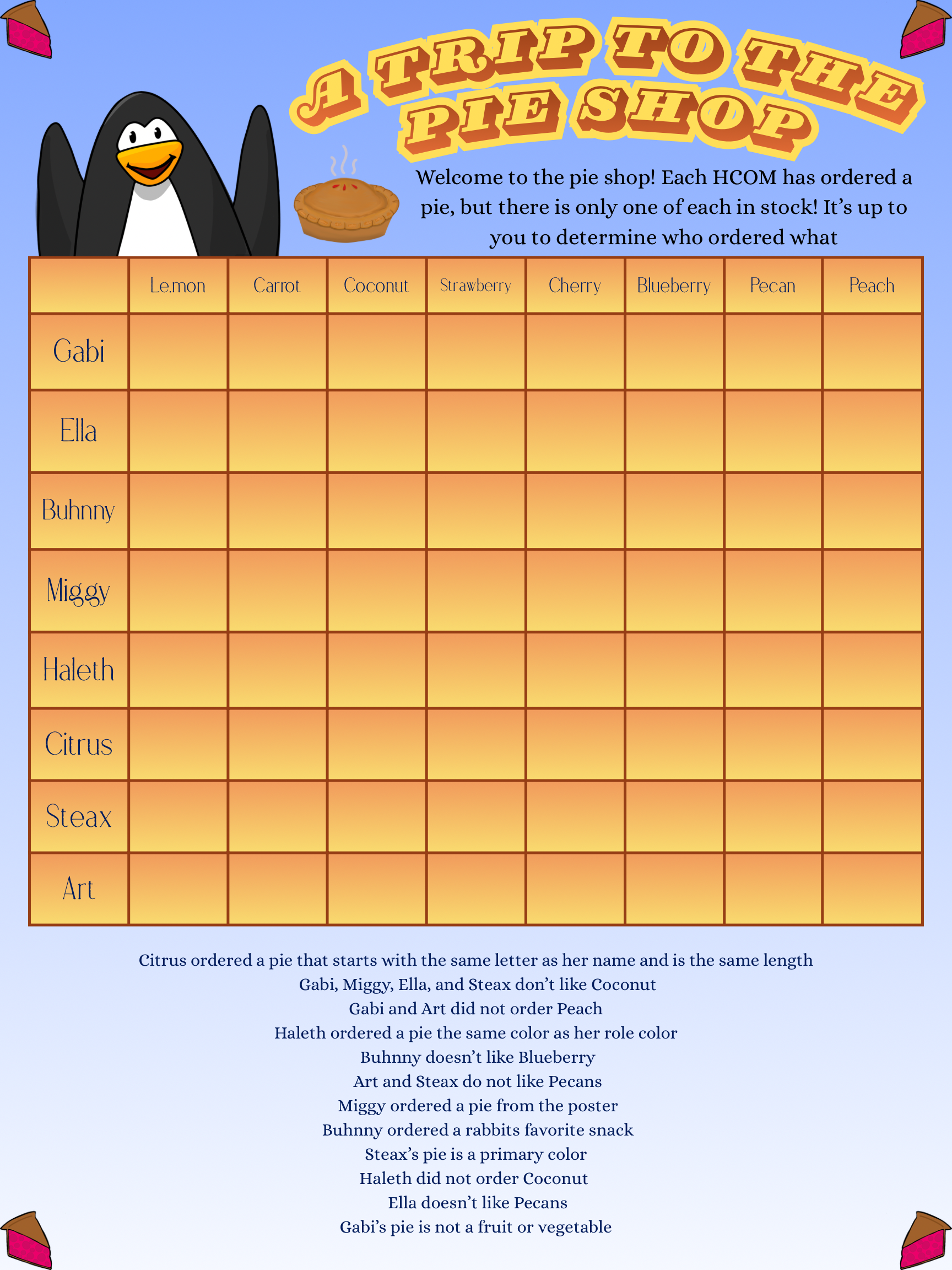 Happy Pi Day! This week, we’re putting on our thinking caps and taking a trip to the pie shop! Miggy baked up a Logic Puzzle and it’s now up to you to figure out who ordered which pie!