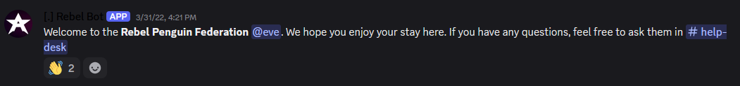 Eve’s first introduction to the Rebel Penguins was on Club Penguin Rewritten when she walked into the middle of a Rebel Penguin Pride event after asking the aged old question “Are you bots“? And joined on March 31st, 2022.