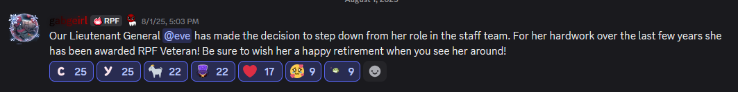 On August 1st, 2025 at the rank of Lieutenant General Eve retired after being enlisted for a total of 40 months!