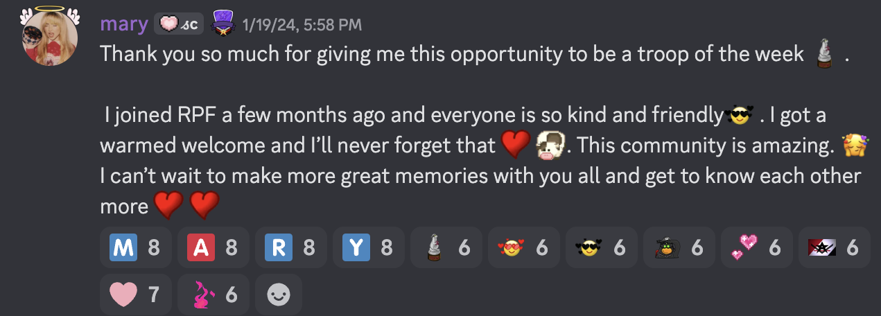 When asked how did you first feel when you joined RPF? and What was it like being a new troop in such a big server? Mary explained that they were scared to talk to everyone at first, but then starting to feel like this was their place to be since everyone was so welcoming. In other words, seeing everyone being so welcoming and kind made them feel that they were able to settle in so quickly ❤️.