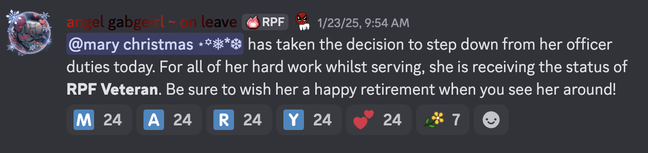 To wrap Mary experience as a mod Mary was asked, “What was your time as staff like, were there any moments that stood out to you as a moderator?“, in which she responded with “I really enjoyed being a staff in RPF, I met so many amazing people and something that I always miss were the staff nights and just randomly being goofy in staff vc or staff chat!“.