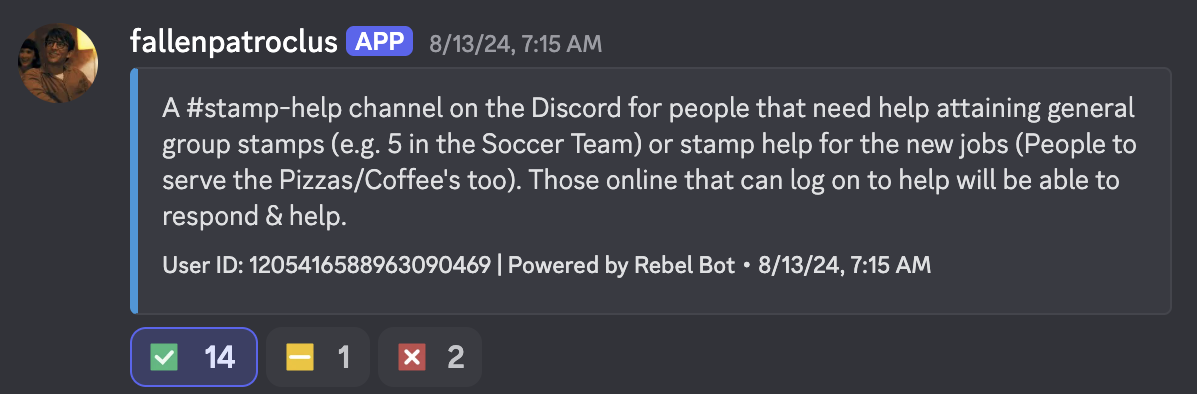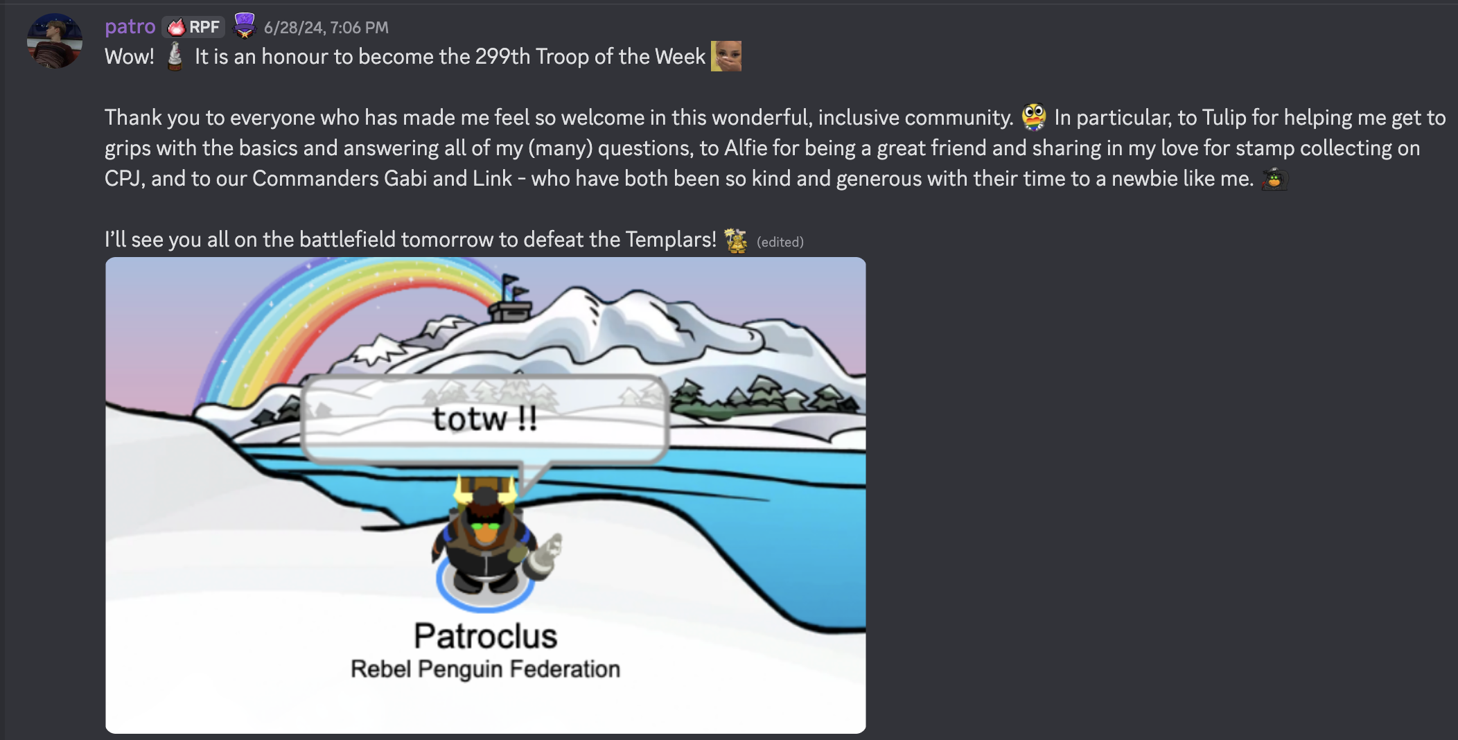 To wrap Patro experience as a mod Patro was asked, ” What was your time as staff like, were there any moments that stood out to you as a moderator?“, in which he responded with ” I had the most incredible time as a staff member in RPF, with so many incredible memories to look back on. Of course, taking part in the big battles such as during the war with the Secret Service, and tournament battles from the Legends Cup XIV and Christmas Chaos. Aside from those major occasions, it was the time spent playing CP Journey with my fellow RPF members, laughing and joking in main/staff chats, hosting fashion show break days with my bestie Buhnny, and getting to be creative through the RPF staff teams, including writing for the CP News, Tuxedo Times and other columns. One very special highlight was in September 2024 when my idea to have a ‘stamp help’ channel on the Discord was introduced, and I think it’s been pretty successful since!”