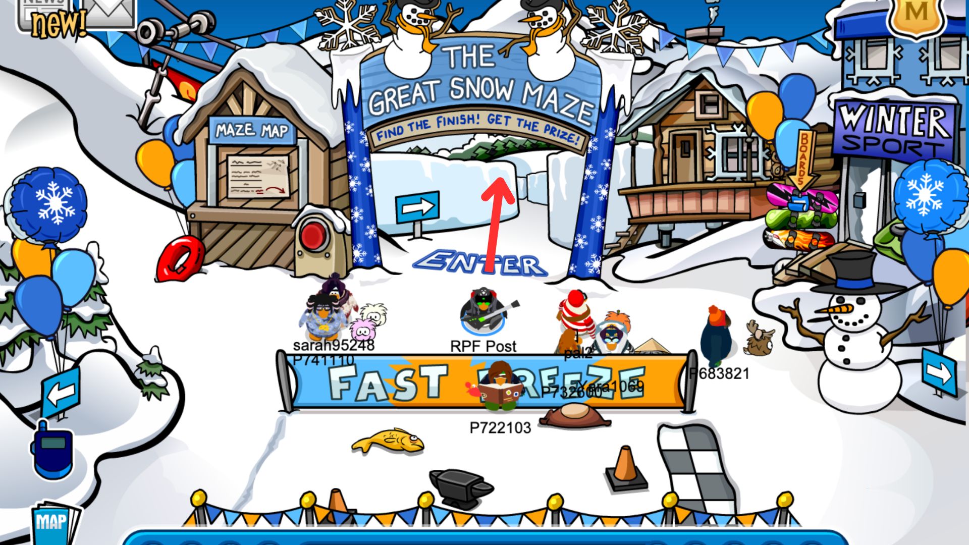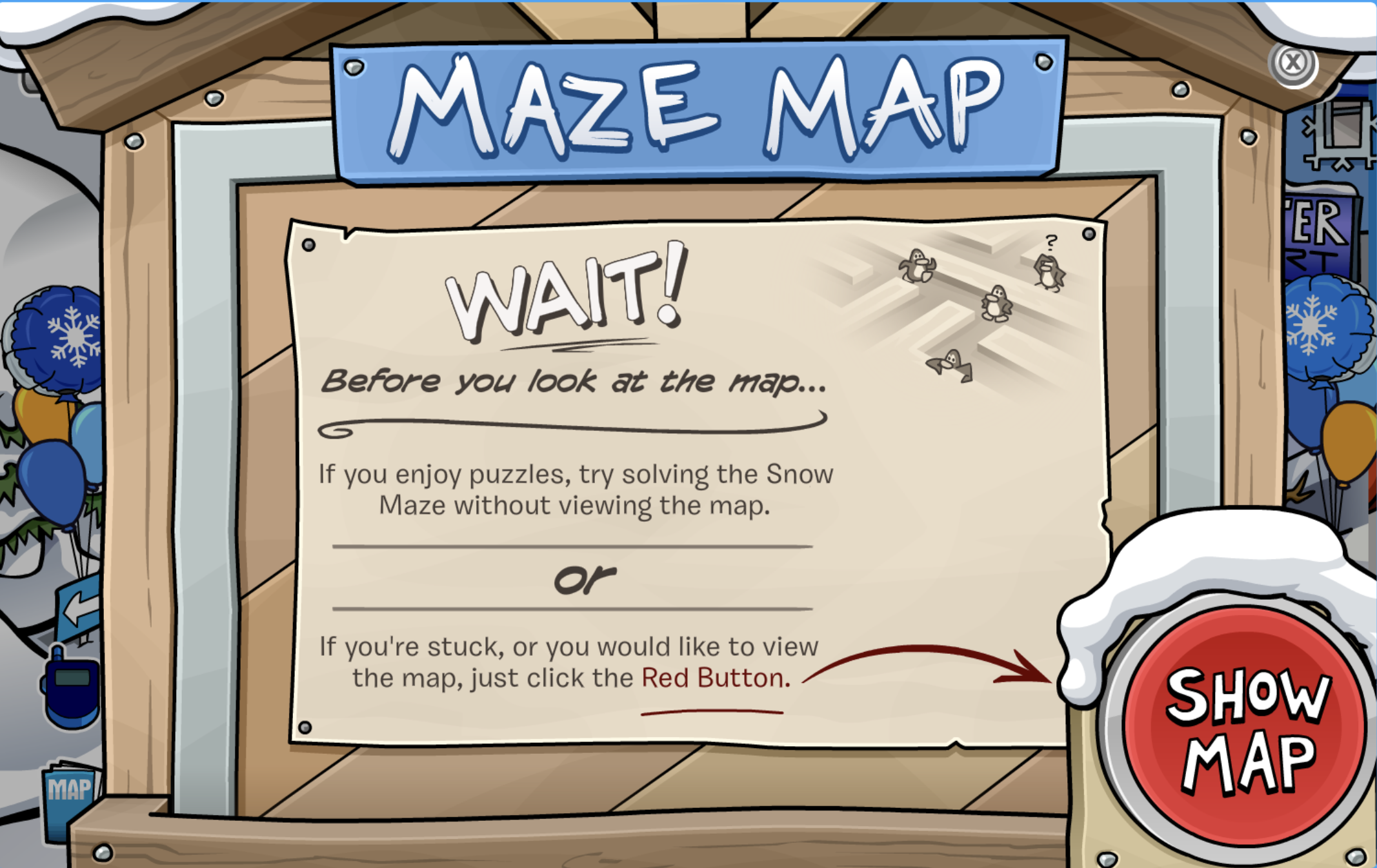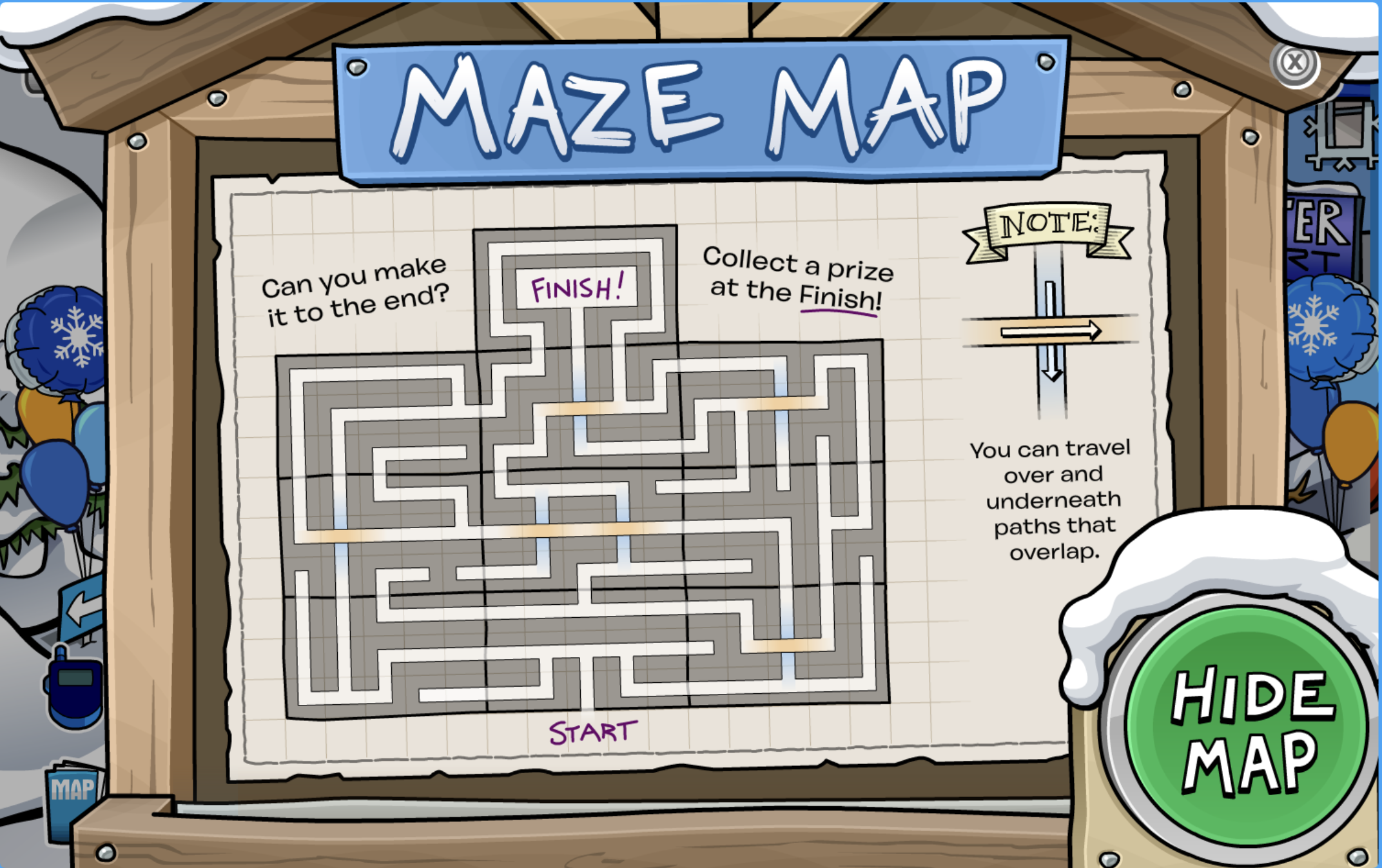 Now let talk about the main part of the party, the maze! Before we enter the maze though, we can find the map if we need some extra help. This can be found at the entrance of the Great Snow Maze, right in the Ski Village.